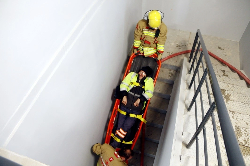 İç mekânda gerçekleştirilen senaryoda ekipler, duman altındaki alanda ilerleme tekniklerini kullanarak yangına kontrollü müdahalede bulundu. Ardından yaralı personel güvenli şekilde tahliye edilerek sağlık ekiplerine teslim edildi. Merdivenli araç kullanımıyla yüksek kat erişim çalışması da planlı ve disiplinli şekilde tamamlandı.