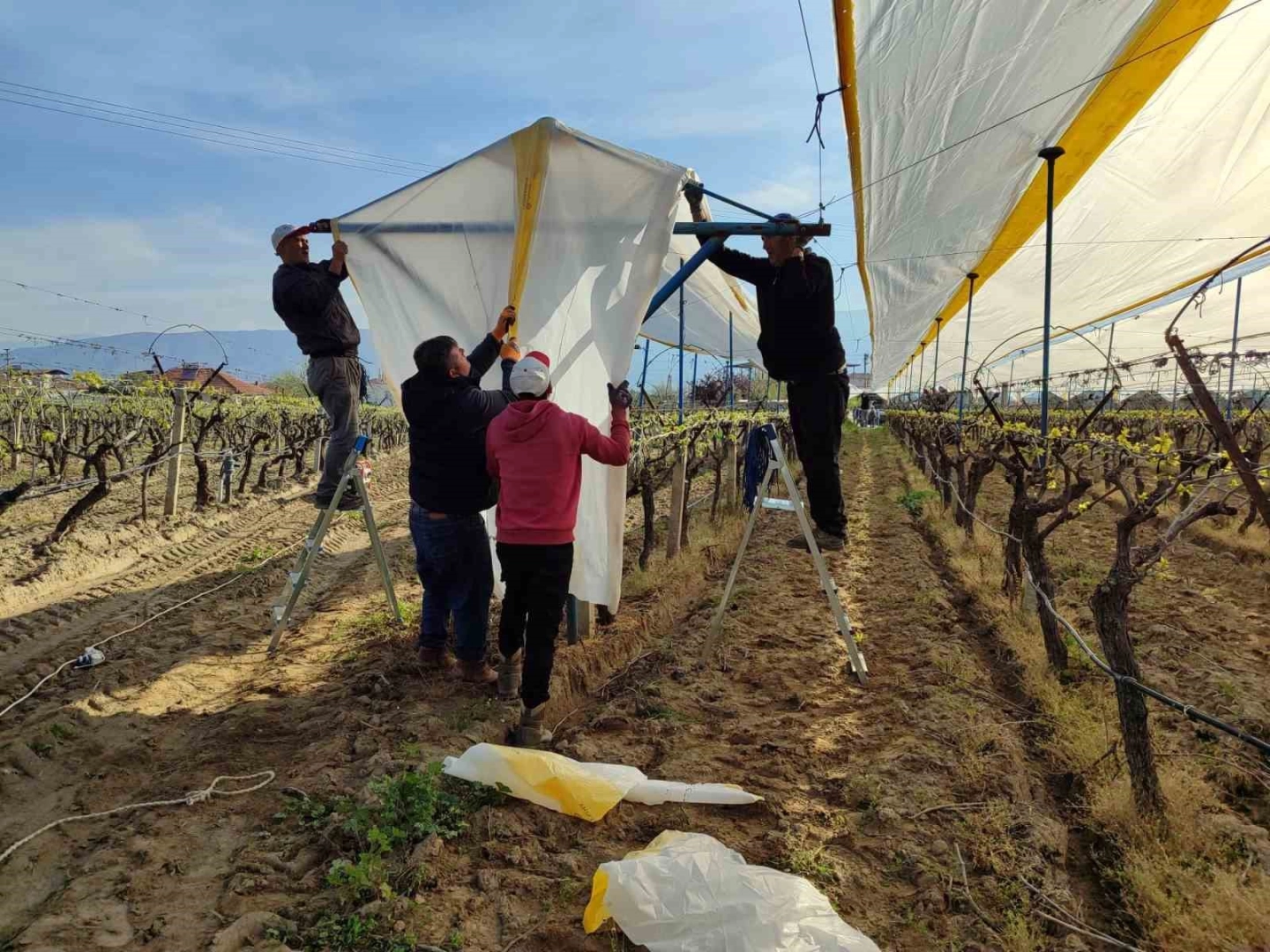 Yapraklanmaya başlayan bağlar, dolu, yağmur ve soğuk havaya karşı koruma altına alınırken, üreticiler ürün kaybını önlemek için bağların üzerini dolu tülleriyle kapatıyor.