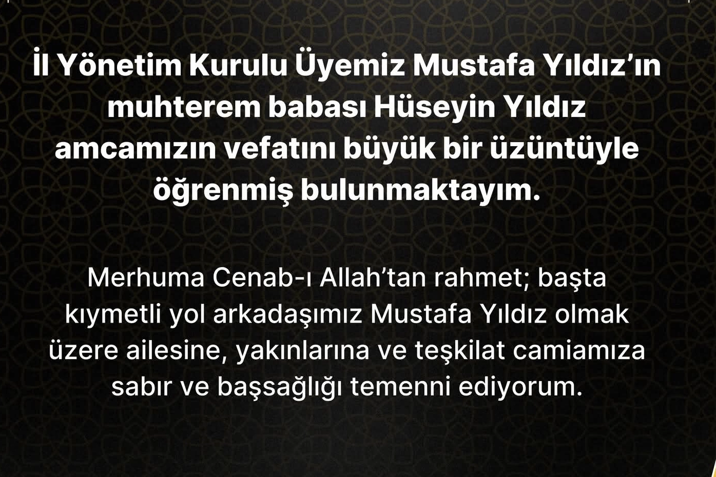 "İl Yönetim Kurulu Üyemiz Mustafa Yıldız’ın muhterem babası Hüseyin Yıldız amcamızın vefatını büyük bir üzüntüyle öğrenmiş bulunmaktayım.