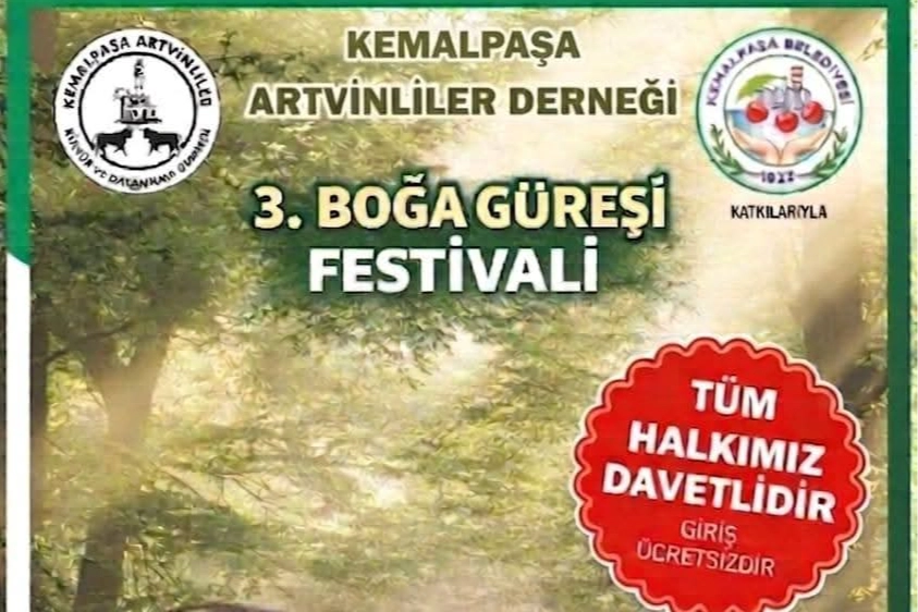 Kemalpaşa Artvinliler Derneği’nin düzenlediği 3. Boğa Güreşi Festivali, geleneksel coşkuyu ve rekabetin en saf halini bir araya getiriyor. Gücün, azmin ve doğallığın buluştuğu bu özel etkinlikte, birbirinden iddialı boğalar arenada kozlarını paylaşacaklarını ifade eden, Başkan Ali Özgüç,” Ege bölgesinde ilk defa yapılacak olan Artvin usulü farklı kilo kategorilerinde gerçekleşecek güreşlerle gün boyu sürecek heyecana sen de ortak ol! Üstelik giriş de ücretsiz” dedi.