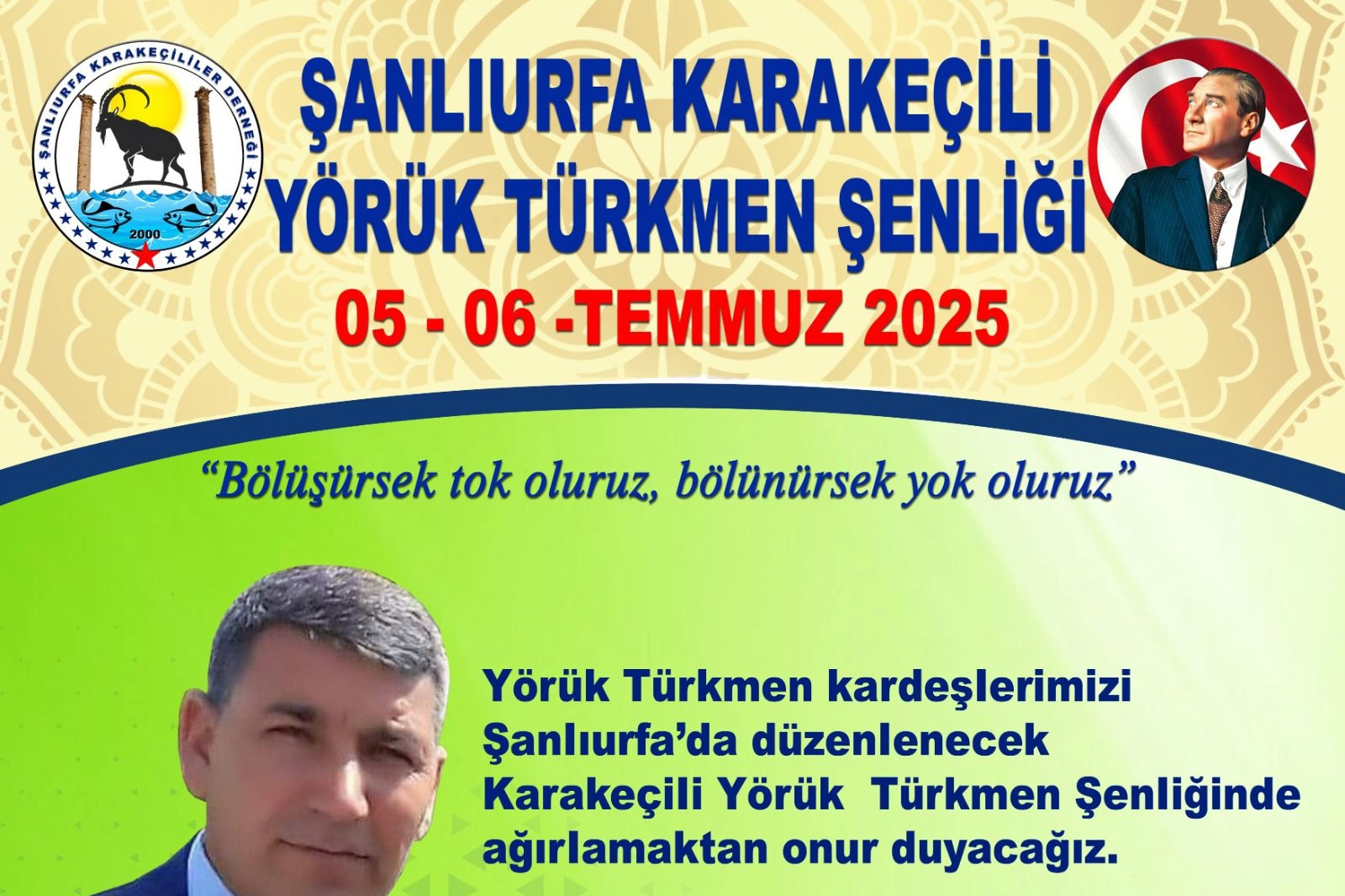 Şanlıurfa’nın tanıtımına ve turizmine katkı sağlayacak olan Karakeçili Yörük Türkmen Şenliği için geri sayımın başladığını söyleyen Şanlıurfa Karakeçililer Dernek Başkanı Halil Karakeçili, “Bu sene ikincisi düzenlenecek olan şenliği 5-6 Temmuz’da. Tüm Yörük ve Türkmenlerimizi 5-6 Temmuz 2025’de Şanlıurfa’mızda yapacağımız Karakeçili Yörük Türkmen Şenliği’mize bekliyoruz. Hem kültürümüzü tanıtacağımız hem de üyelerimizle keyifli zaman geçireceğimiz bu şenlik ülke çapında da son derece önem taşıyor. Tüm camiamıza hayırlı uğurlu olsun.” dedi.