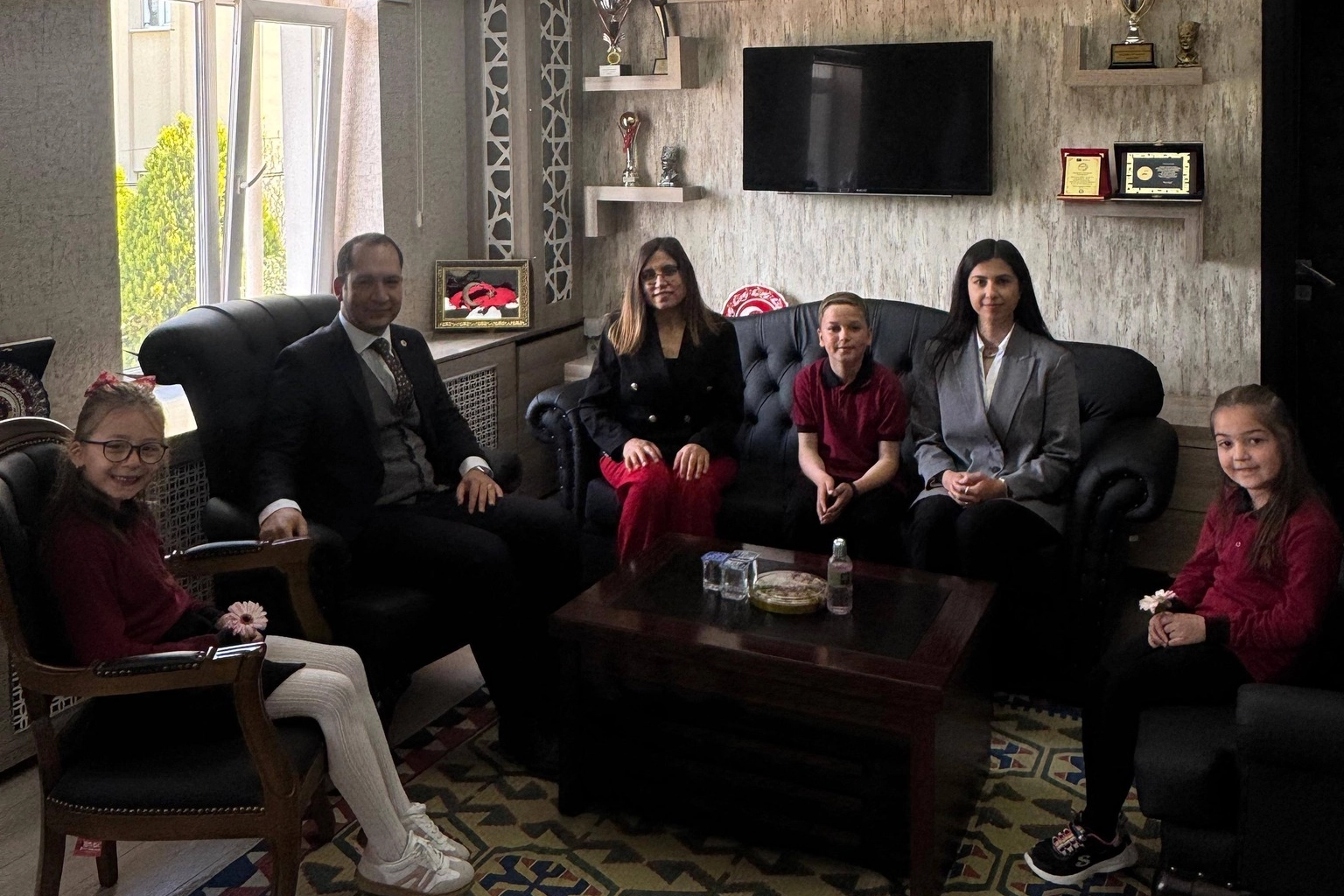Ulubey Kaymakamı İbrahim Coşkunaslan 23 Nisan daolayısıyla Kuva-i Milliye İlkokulundan Müdire Fatma Çöllü, öğretmen Ezgi Öztürk ve öğrencileri kabul etti