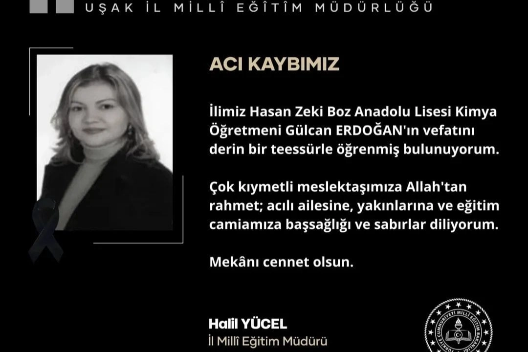 Uşak İl Milli Eğitim Müdürü Halil YÜCEL vefat eden Gülcan Erdoğan için bir ta iye mesajı yayınladı. Yücel mesajında "Acı Kaybımız İlimiz Hasan Zeki Boz Anadolu Lisesi Kimya Öğretmeni Gülcan ERDOĞAN'ın vefatını derin bir teessürle öğrenmiş bulunuyorum.