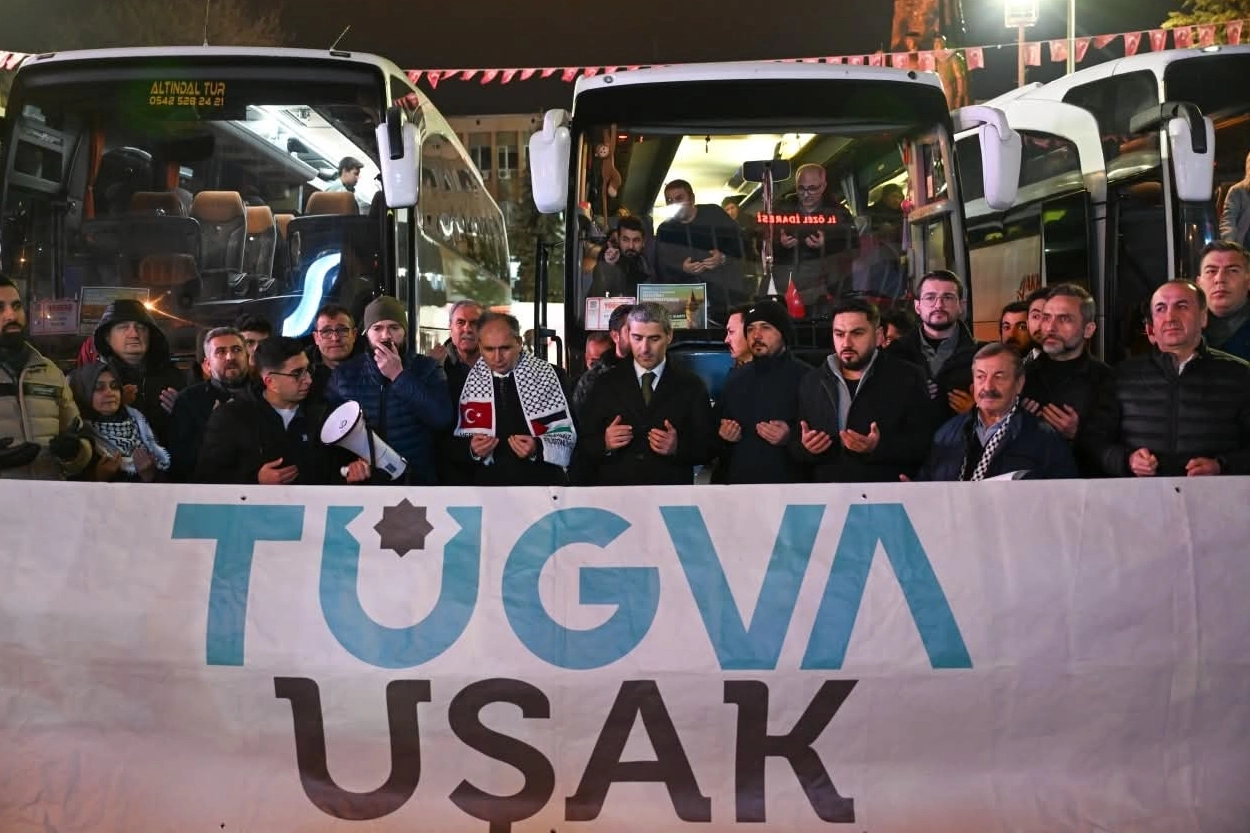 TÜGVA vakfının İstanbul'da Galata Köprüsünde koordine ettiği Filistin yürüyüşüne Uşak'tan katılmak için yola çıkanları Uşak Valisi Naci Aktaş uğurladı.