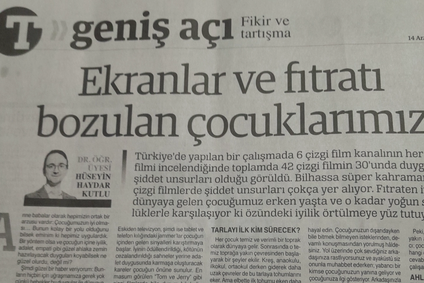 Uşak Üniversitesi Doktor Öğretim Üyesi Hüseyin Haydar Kutlu'nun "Ekranlar ve Fıtratı bozulan Çocuklarımız " başlıklı makalesi bugünkü Türkiye Gazetesinin Geniş Açı Fikir ve Tartışma köşesinde yayımlandı.