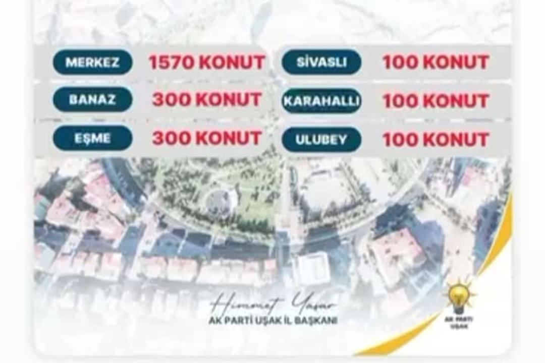 Açıklanan projeye göre Uşak'a ilçeleriyle birlikte 2470 konut yapılacak. Bu 2470 konutun 1570 adedi Uşak merkeze,300 adet Banaz, 300 adet Eşme ve 100 er adette Ulubey,Karahallı ve Sivaslı ilçelerine yapılacağı açıklandı.