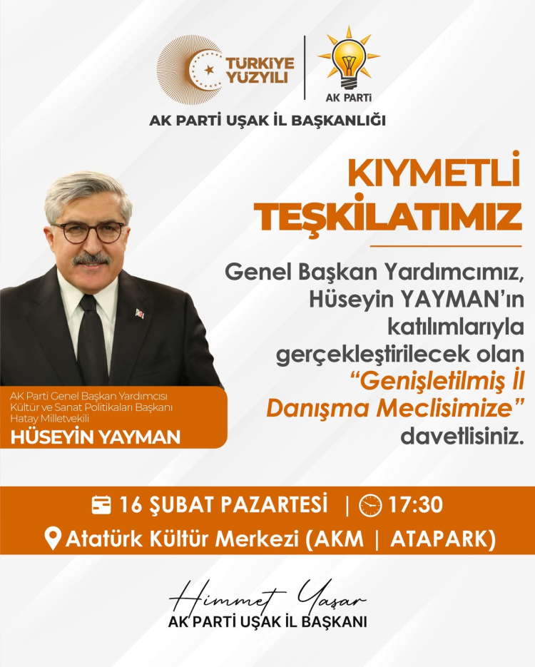 Ak Parti Kültür ve Sanat Politikaları Başkanı olan Hüseyin Yayman 16 şubat 2026 pazartesi öğle saatinde Ak Parti İl Başkanlığında bir basın toplantısı yapacak ve aynı gün saat 17 30 da AKM de yapılacak İl Danışma Meclisi toplantısına katılacak