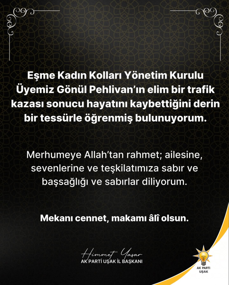 Ak Parti Uşak İl Başkanı Himmet Yaşar trafik kazasında vefat eden Ak Parti Eşme Kadın Kolları Yönetim Kurulu Üyesi Gönül Pehlivan için taziye mesajı yayınladı.