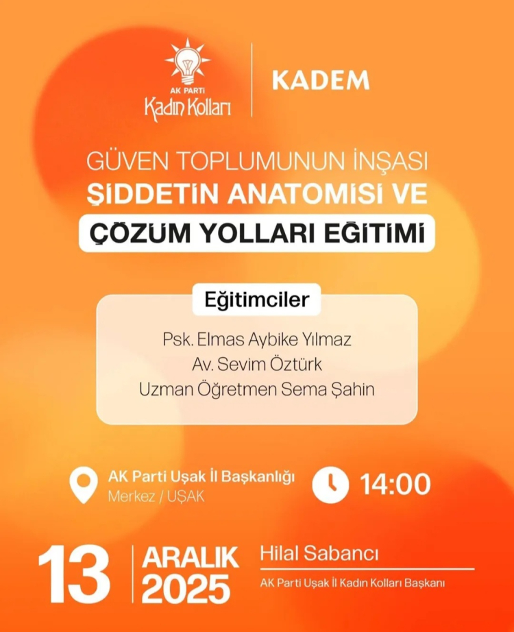 "Güven toplumunun inşası, şiddetin anatomisi ve Çözüm yolları " başlıklı toplantı 13 aralik cunartesi saat 14.00 te Ak Parti Uşak İl Binasında yapılacak.