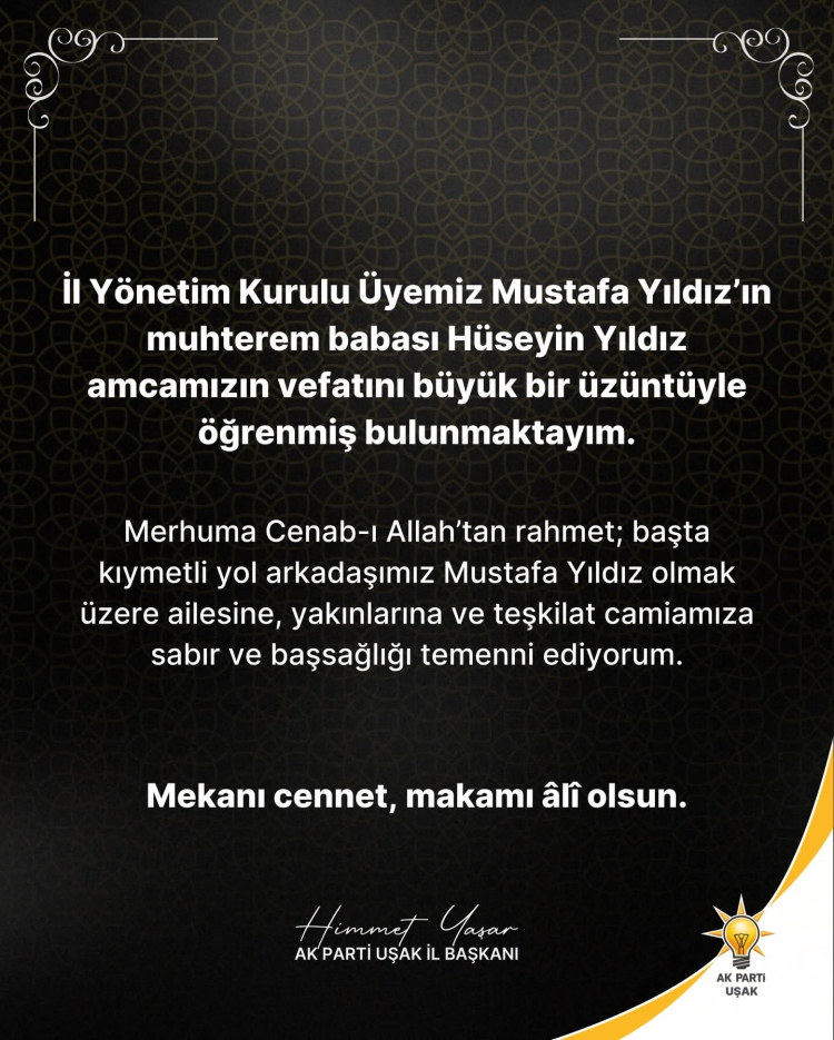 Ak Parti Uşak İl Başkanı Himmet Yaşar Ak Parti İl Yönetim Kurulu Üyesi Mustafa Yıldız'ı babasının vefatı nedeniyle taziye mesajı yayınladı.