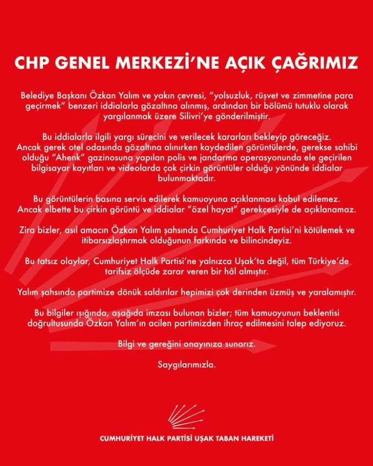 Uşak CHP Taban hareketi açık çağrı diyerek CHP Genel Merkezinden tutuklu Özkan Yalım'ın acilen partiden ihraç edilmesini istedi.