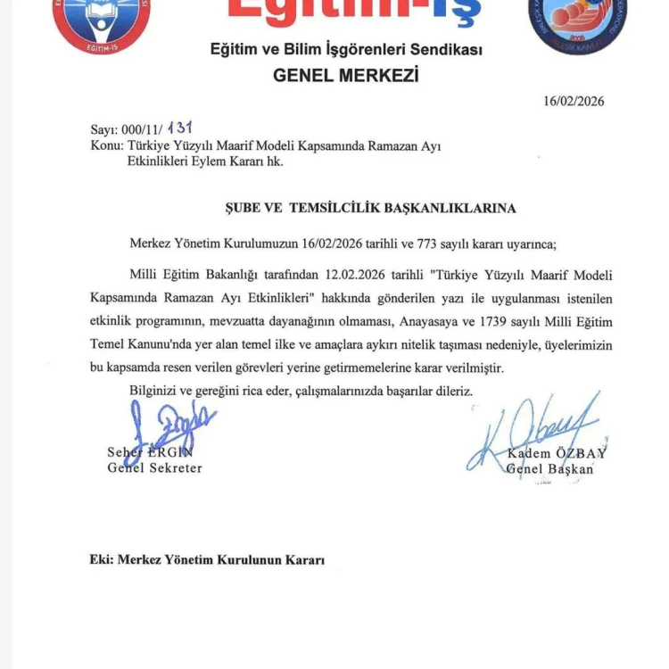 Eğitim İş Sendikasınin okullarda Ramazan kutlaması hakkında aldığı karar