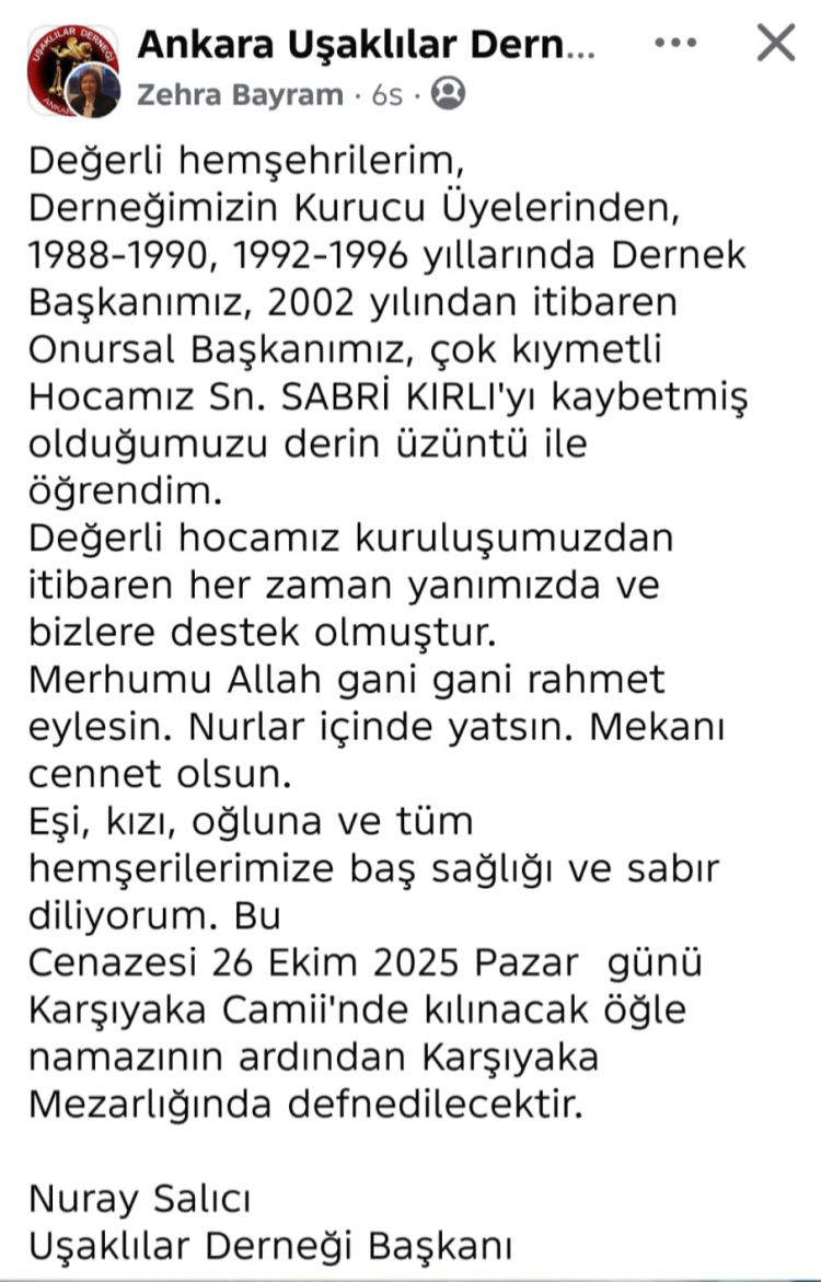 Ankara Uşaklılar Derneği onursal başkanı Sabri Kırlı'nın cenazesinin bugün öğle namazına müteakip Karşıyaka Camiinde kılınacak cenaze namazından sonra Karşıyaka mezarlığına defnedileceği açıklandı