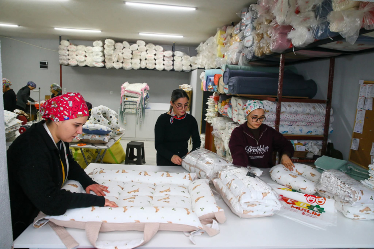 Aras, kurduğu üç katlı atölyesinde anne yanı yatağı, emzirme simidi, kundak, nevresim takımları, yorgan ve battaniye gibi 14 çeşit ürün üretiyor.