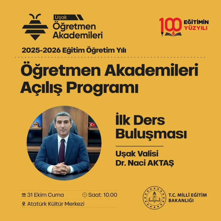 Millî Eğitim Bakanlığı öncülüğünde, Valiliğin himayelerinde ve İl Millî Eğitim Müdürlüğümüzün koordinasyonunda hazırlanan Uşak Öğretmen Akademilerinin açılış programı ve “İlk Ders Buluşması” 31 Ekim 2025 tarihinde gerçekleştirilecek.