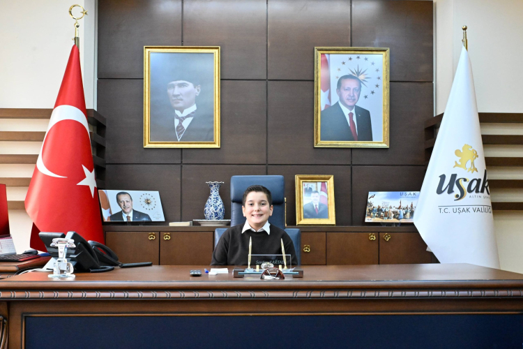 Uşak Valisi Serdar Kartal Koltuğunu Yaşar Akar ilkokulu öğrencileri Mina Bilgin ve Ahmet Metin Baytok’a devretti.