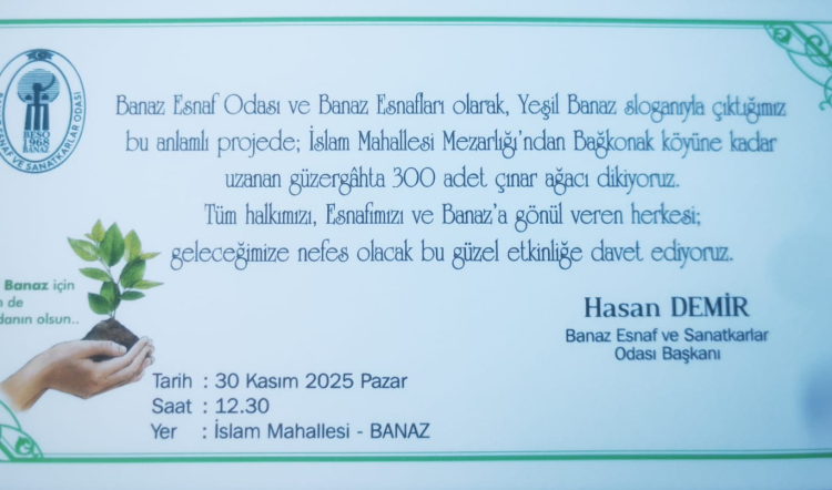 Banaz Esnaf Odası Başkanı Hasan Demir, “Yeşil Banaz İçin Senin de Bir Fidanın Olsun” sloganıyla doğaya sahip çıkma ve ilçenin yeşil alanlarını artırma amacıyla büyük bir ağaçlandırma etkinliği düzenleneceğini duyurdu.