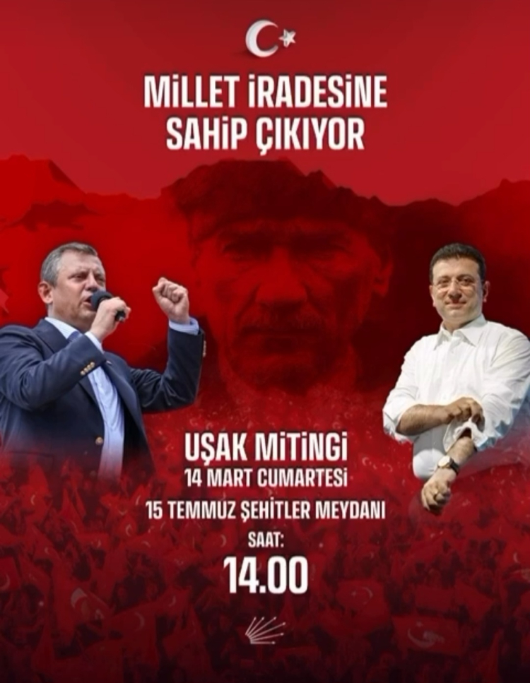 Parti örgütleri tarafından yapılan duyurularda, 14 Mart Cumartesi günü düzenlenecek “Millet İradesine Sahip Çıkıyor” mitingine tüm Uşak halkı davet edilirken, Genel Başkan Özgür Özel’i karşılamak için vatandaşların miting alanında buluşması çağrısı yapıldı.