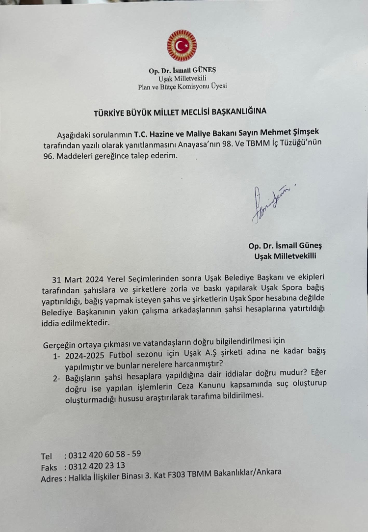 Uşak Ak Parti Milletvekili İsmail Güneş, Uşak spor'a yapılan yardımlarla ilgili Hazine ve Maliye Bakanlığına soru önergesi verdi.