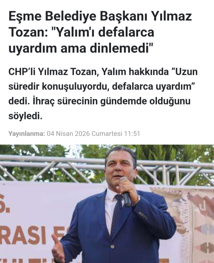 "Uşak Belediye Başkanı Özkan Yalım hakkında yürütülen soruşturma ve ortaya atılan iddialar siyaset gündemindeki yerini korurken, CHP’li Eşme Belediye Başkanı Yılmaz Tozan dikkat çeken açıklamalarda bulundu.