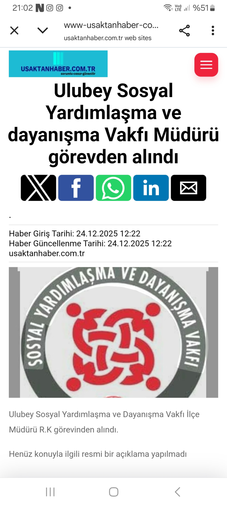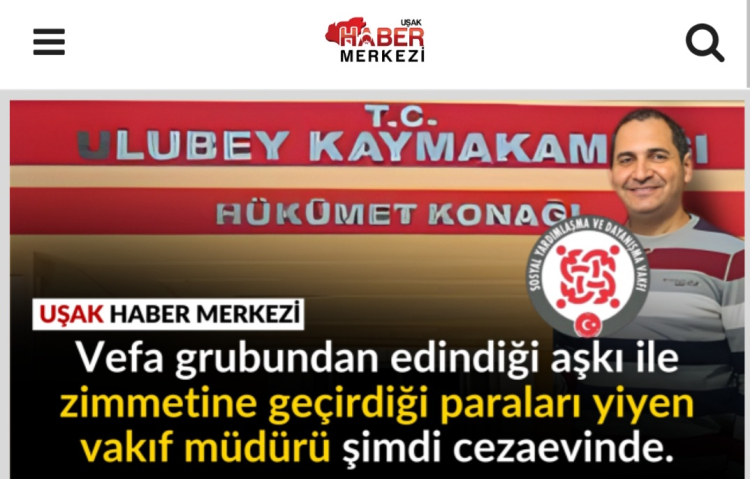 24 Aralık 2025 tarihinde Ulubey’de Sosyal Yardımlaşma Vakfı Müdürü R. K nın görevden alındığı haberini aldık.